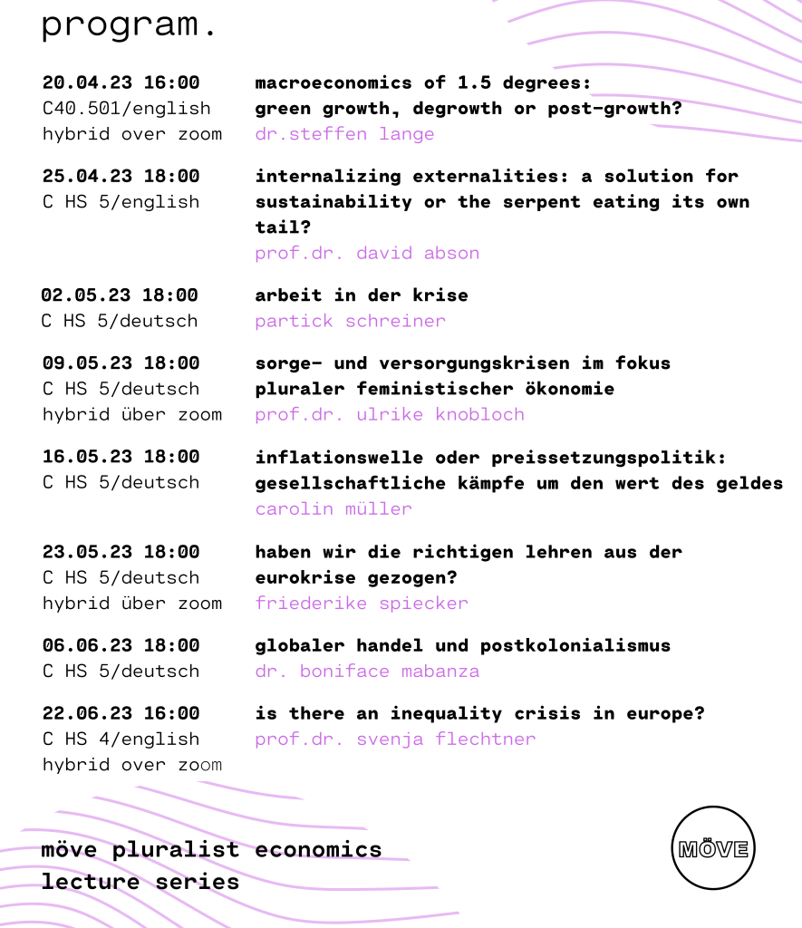 In our lecture series we want to take a look behind the scenes and show possible solutions for social crises. The topics range from post-growth, unions, feminist economics and post-colonialism to the euro crisis, inequality and monetary theory.